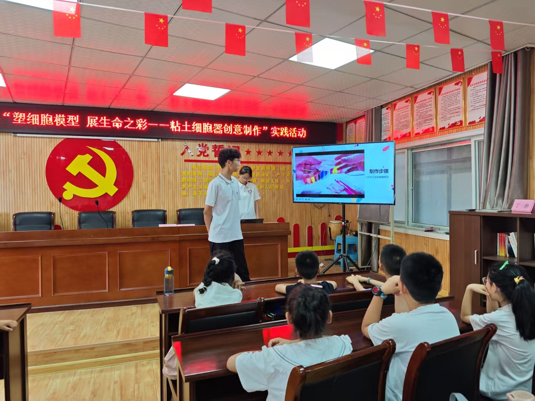 实践活动开始前,志愿者借助精心准备的PPT,生动形象地向孩子们讲解细胞的基本结构及细胞器的独特功能,耐心解释孩子们提出的一个个问题。讲解结束后,志愿者们为每个孩子分发了色彩斑斓的粘土,让孩子们在志愿者们的指导下自己动手制作。