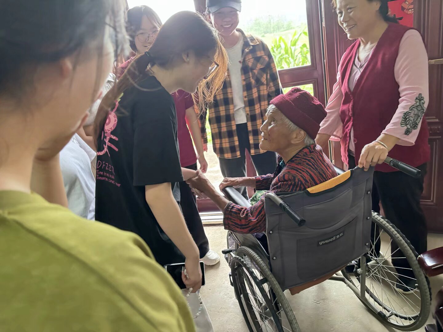 第二天上午,实践团队走进当地养老院进行慰问。成员们分组与老人亲切交谈,倾听他们的人生故事。在一间房间里,一位老人指着墙上的老照片,向成员们缓缓讲述自己年轻时作为教师在乡村学校的岁月。随后,团队为老人带来了精彩的节目表演,歌曲演唱赢得了老人们的阵阵掌声。表演结束后,成员们将精心准备的中医药相关小礼物,如中药按摩捶、养生手册等送到老人手中。当天下午,团队中的医学专业成员为老人提供健康义诊服务,测血糖、按摩等项目有序开展。在测血压过程中,专业成员仔细操作,认真记录数据,并根据每位老人的情况给予健康建议。一位老人拉着成员的手说:“你们来了,我们心里就踏实。”
