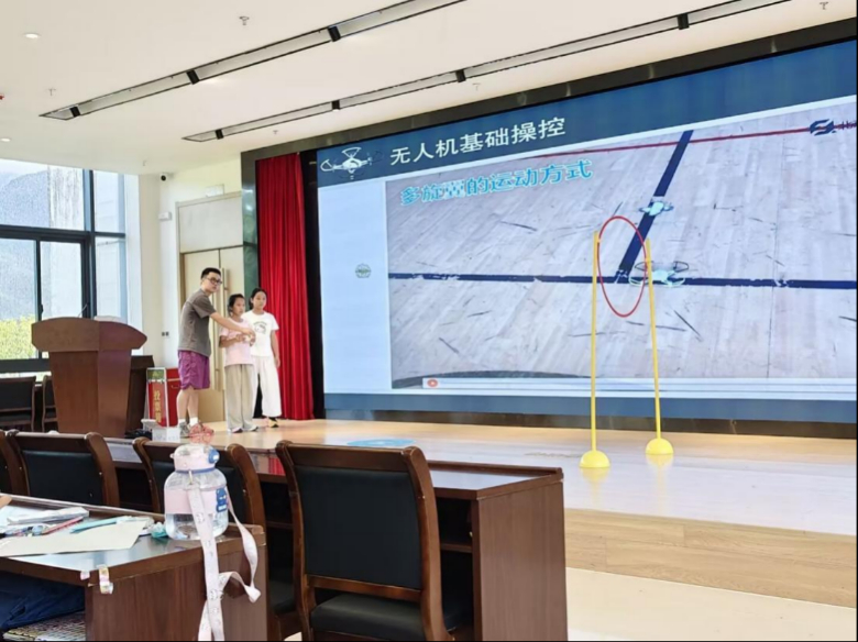 当生态与科技碰撞,点燃了学生们的探索热情。暑托班举办了绘画比赛,学生们围绕“家乡生态与家国情怀”主题挥洒创意,其中第二小组的《绿水青山守护者》以九华山风光为背景,融合五星红旗与护林员形象,将自然之美与责任担当巧妙融合,成为比赛亮点。科技课程同样精彩纷呈:AR英语课上,孩子们通过智能眼镜与“立体动物”互动,在沉浸式场景中轻松掌握英语词汇;无人机实操课上,从理论学习到障碍穿越、定点悬停,孩子们在一次次操控中感受科技魅力。这些科技课程的引入,打破了传统课堂的局限,为乡村孩子打开了一扇通往科技世界的窗户。在科技日益发展的今天,这样的启蒙教育能够让孩子们尽早接触前沿科技,培养科学思维与动手能力,缩小城乡在科技认知上的差距,为他们未来适应科技社会、参与科技创新埋下希望的种子。