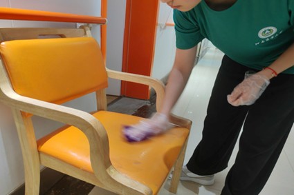 移步休息区,另一番认真的图景展开。志愿者微微俯身,透明手套贴合着手部,紫色抹布在橙色座椅上轻柔游走。她顺着座椅纹理擦拭,遇到污渍,便放慢动作,反复轻抹,像是在雕琢一件珍贵器物。每一下擦拭,都带着让老人坐得舒适、看得舒心的期许。这一方座椅,承载的将不只是老人休憩的身体,更是志愿者们用心营造的温馨角落,让老人能安心在此晒太阳、话家常。