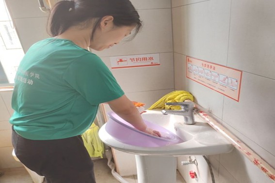 志愿服务不止于陪伴。志愿者们主动承担社区卫生清扫重任,分工明确、协作有序。卫生间内,他们细致刷洗便池、擦拭台面,清除顽固污渍;公共活动区里,从桌椅缝隙到墙角旮旯,都被仔细清理,不放过一丝灰尘、一片垃圾。即便汗水浸湿衣衫,他们仍不停歇,一心为老人营造整洁舒适的生活环境,用双手传递实打实的温暖。