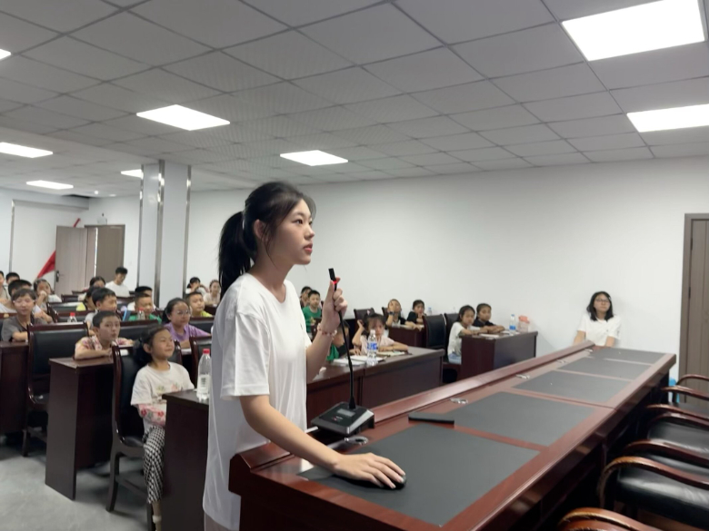 (图为队员孙雨霏正在讲解古典音乐知识) 课堂以孩子们熟悉的经典动画为切入点,以听音乐猜动画的热身活动成功吸引学生兴趣,精选《猫和老鼠》中的《匈牙利狂想曲》、《春日圆舞曲》等著名古典音乐,通过“看动画、辨旋律、讲背景”的互动形式,引导孩子们在光影与旋律的交织中,感受古典音乐的节奏与情感。从最初对“古典乐”的陌生,到跟着动画情节轻打节拍,再到师生共同完成乐队模拟及固定拍小游戏,孩子们的眼神里逐渐点亮了对音乐的好奇与热爱。
