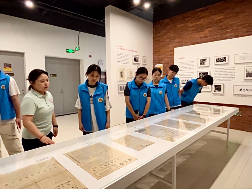 图为实践队成员俯身观摩馆藏的共大建校报纸