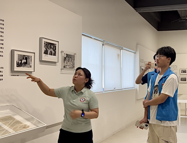 图为实践队成员跟随讲解员步伐进入展厅共大校门
