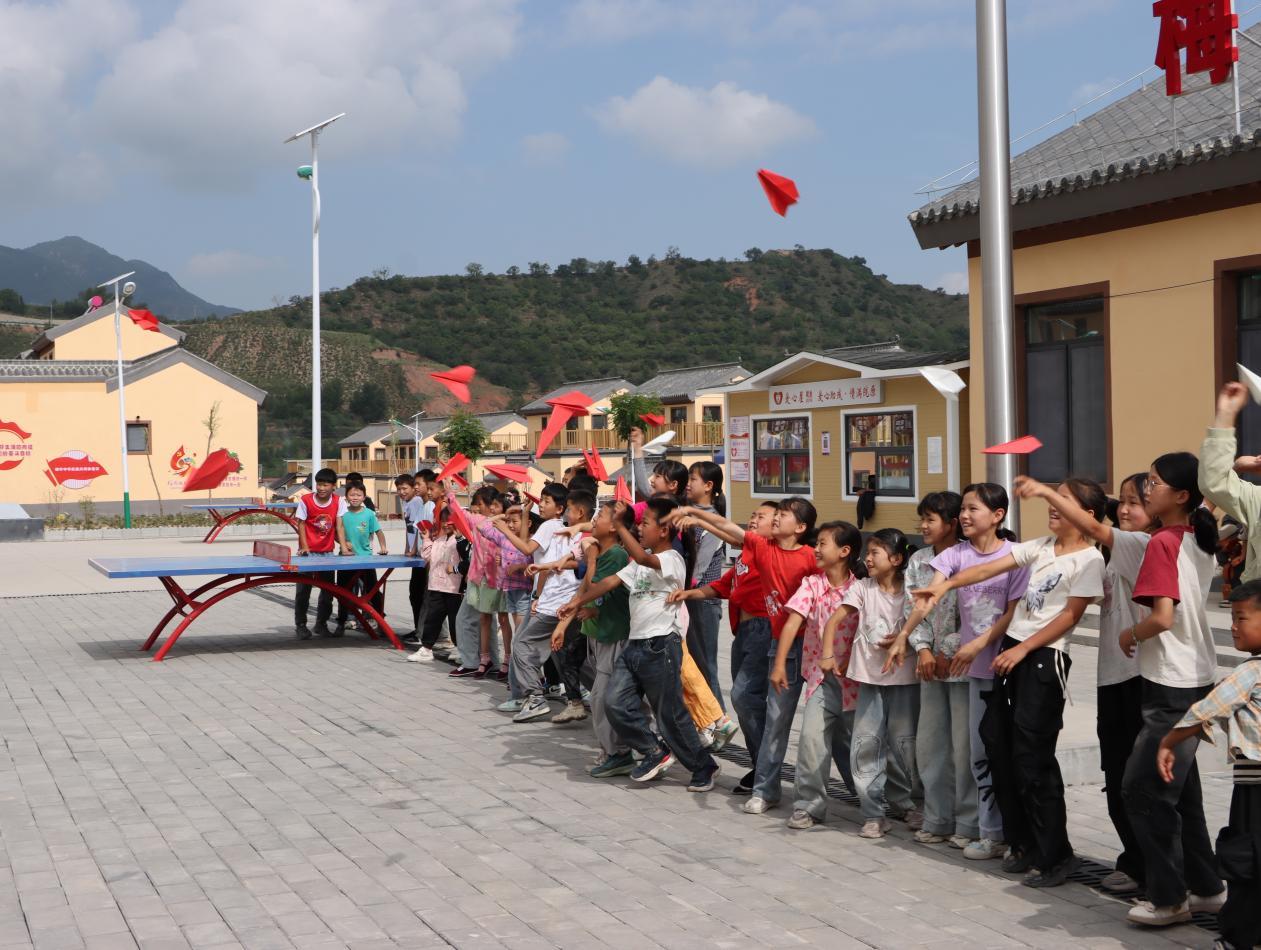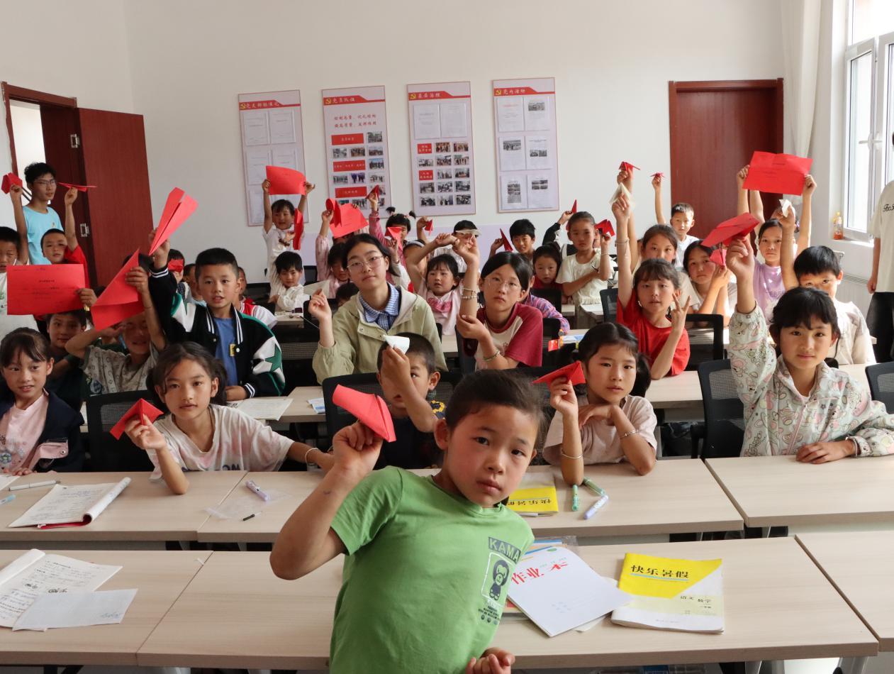 课堂互动环节,孩子们在志愿者的引导下,将自己的梦想写在彩纸上,折成纸飞机奋力放飞。五彩的纸飞机在阳光下划出优美的弧线,象征着纯真的梦想与家国未来的紧密相连。“我长大后想当一名军人,保卫祖国!”一位小男孩高举纸飞机,眼神坚定地说道。