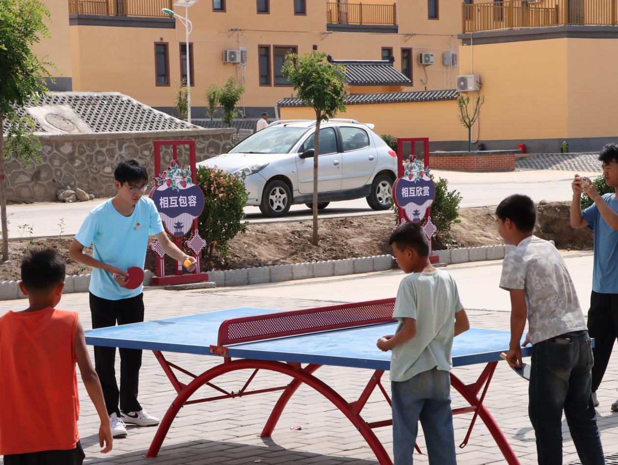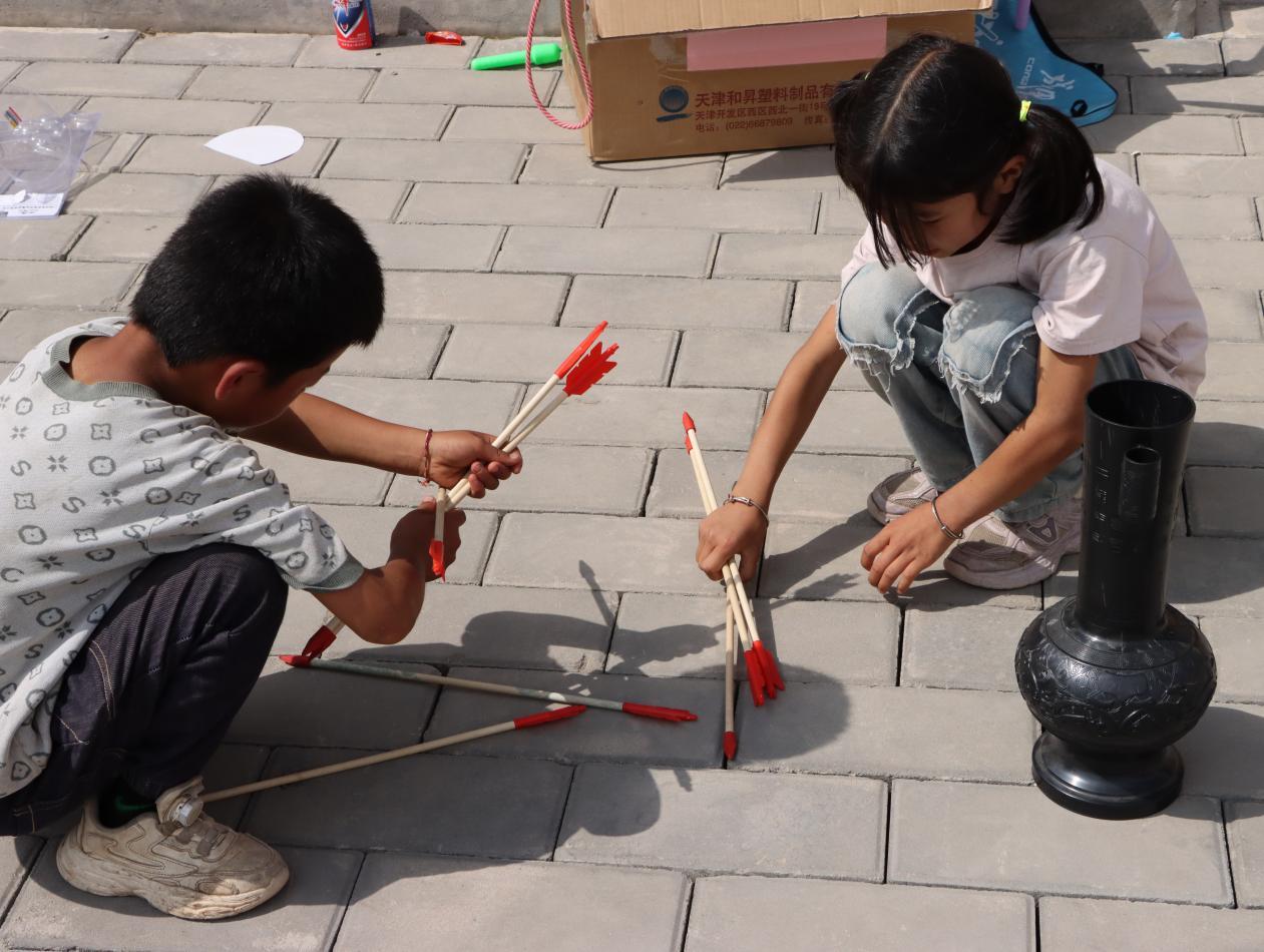 随后,志愿者们组织孩子们体验传统投壶游戏。小小的箭矢在孩子们手中或稳或急地飞出,每当箭入壶中,便引来一阵欢呼。乒乓球、羽毛球等自由活动时间,孩子们更是尽情释放活力,欢声笑语回荡在村子上空。