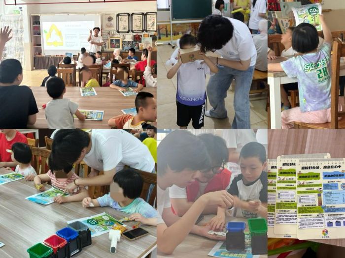 在科技创新与环保教育融合环节中,志愿者以“VR探秘+低碳行动”双主线展开活动。科创课堂上,志愿者用吸管、纸盒等材料指导孩子们制作简易VR眼镜,戴上自制的设备观看3D科普视频,孩子们惊叹“星星好像触手可及”;在“碳金融知识问答”中,通过海报解析、情景模拟等方式,将复杂的低碳概念转化为生活实例。并带领孩子们通过垃圾分类桌游,了解环保知识。老师还回收安全知识垫板与海报,改造为课堂教具,践行资源循环理念。