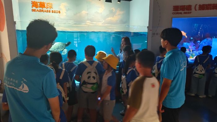 7月2日,团队成员抵达科技馆,便迅速投入到工作中。助力来自江苏镇江中学的“驭梦镇江研学团队”和威海天立夏校的研学活动,成员们化身“海洋科普小助手”,协助馆内工作人员引导参与研学的中小学生有序参观。他们耐心解答同学们对海洋生物、海洋科技知识的疑问,通过生动有趣的语言,将晦涩的海洋知识转化为通俗易懂的内容,激发同学们对海洋世界的探索热情。