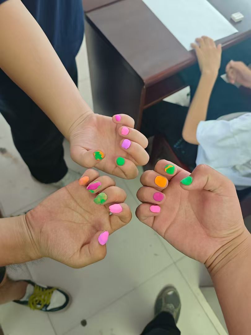 同时,课堂上的互动环节也对孩子们的心理健康成长起到了积极的促进作用。当孩子们拿着自己的作品向老师和小伙伴展示时,他们在分享中获得了认可和尊重,这有助于提升他们的自我价值感。而给老师制作 “美甲” 的互动,则让孩子们感受到了与老师之间的平等和亲密,这种良好的师生关系能够增强孩子们的安全感和归属感。
