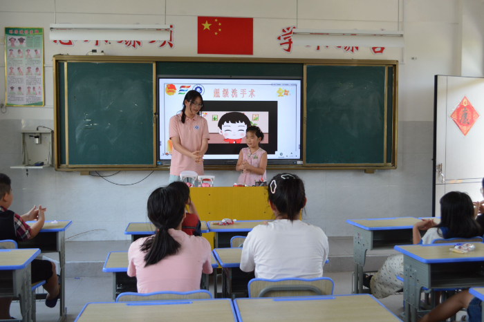 卫生健康知识教学环节,实践队聚焦基础卫生习惯养成,通过生动标准的示范与互动体验,系统传授了科学有效的“巴氏刷牙法”与“七步洗手法”。孩子们伸出双手认真学习,在寓教于乐中点燃了守护个人健康的“星火”,让勤洗手、爱刷牙的良好习惯如涓涓清泉,流淌入日常生活,为茁壮成长筑起第一道防线。