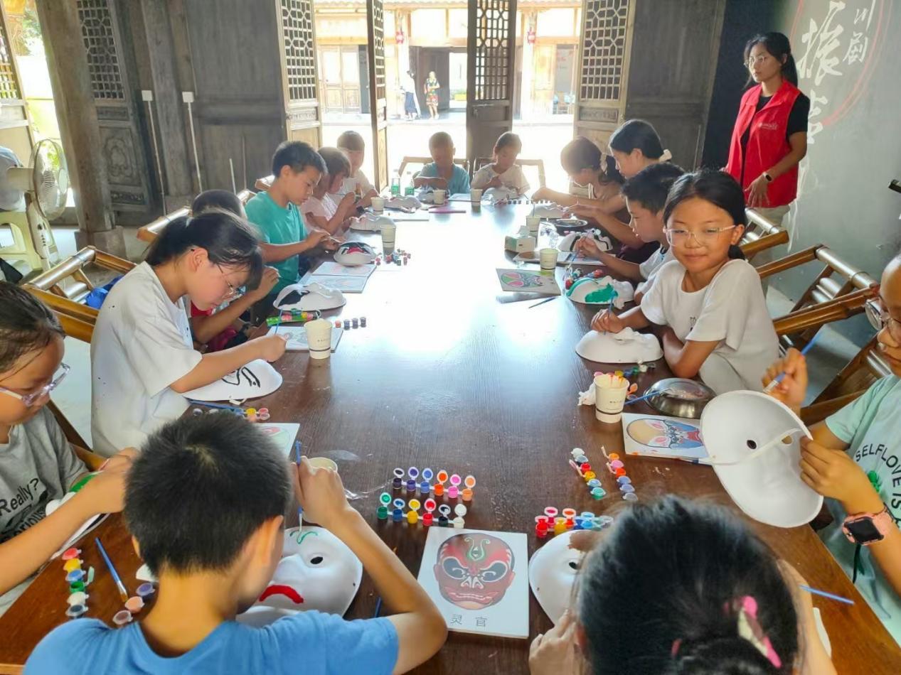 川剧脸谱绘画: 讲解脸谱象征(红脸忠勇、白脸奸诈、黑脸刚正),指导孩子们专注勾勒、填色,绘制个性脸谱,自豪感油然而生,传统魅力扎根心田。