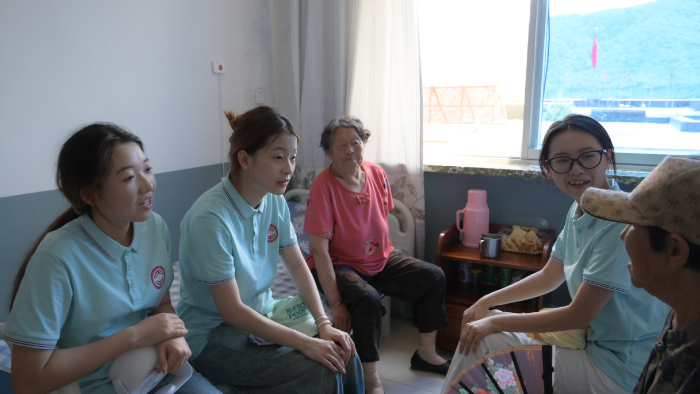 图为夏乡萤火乡村振兴实践团与敬老院老人交谈,康博森摄