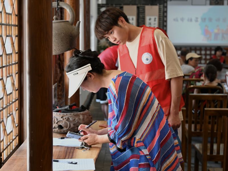 图为队员指导居民填写签到表。 通讯员 余仲秋 摄