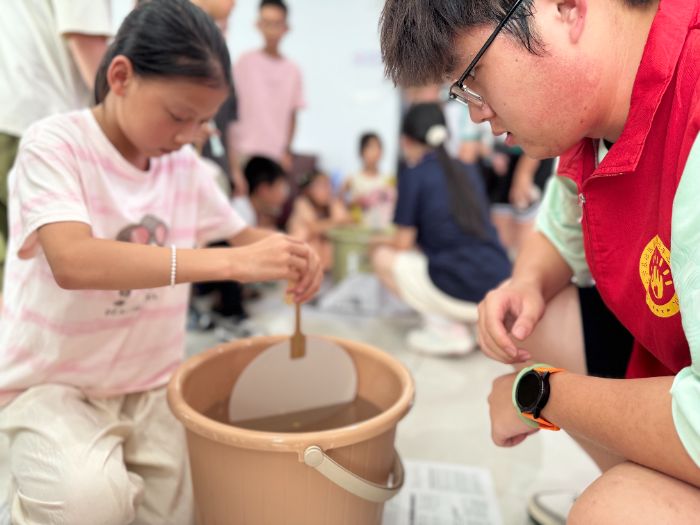 在实践环节,志愿者耐心指导小朋友们勾勒轮廓、调配色彩,他们在志愿者指导下自己动手制作漆扇。从冷暖色系的对撞,到点金工艺的创新,小朋友们进行传统技法与现代审美的融合创作。经过近一小时创作,原本素净的扇面变成了一幅幅充满童趣的作品,孩子们兴奋地展示着自己的非遗大作。