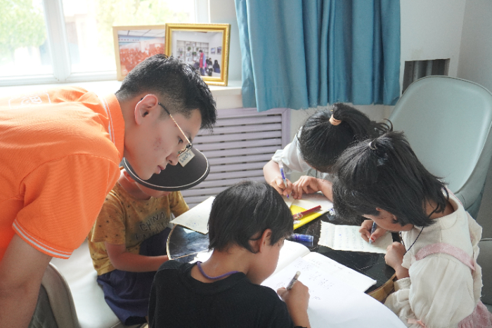 中午锁南镇城南社区养老服务中心,早早便传来孩子们的欢声笑语。实践队队员们迅速与到来的少数民族留守儿童们熟络起来。针对当地留守儿童假期作业无人辅导的实际需求,实践队精心策划作业辅导环节。