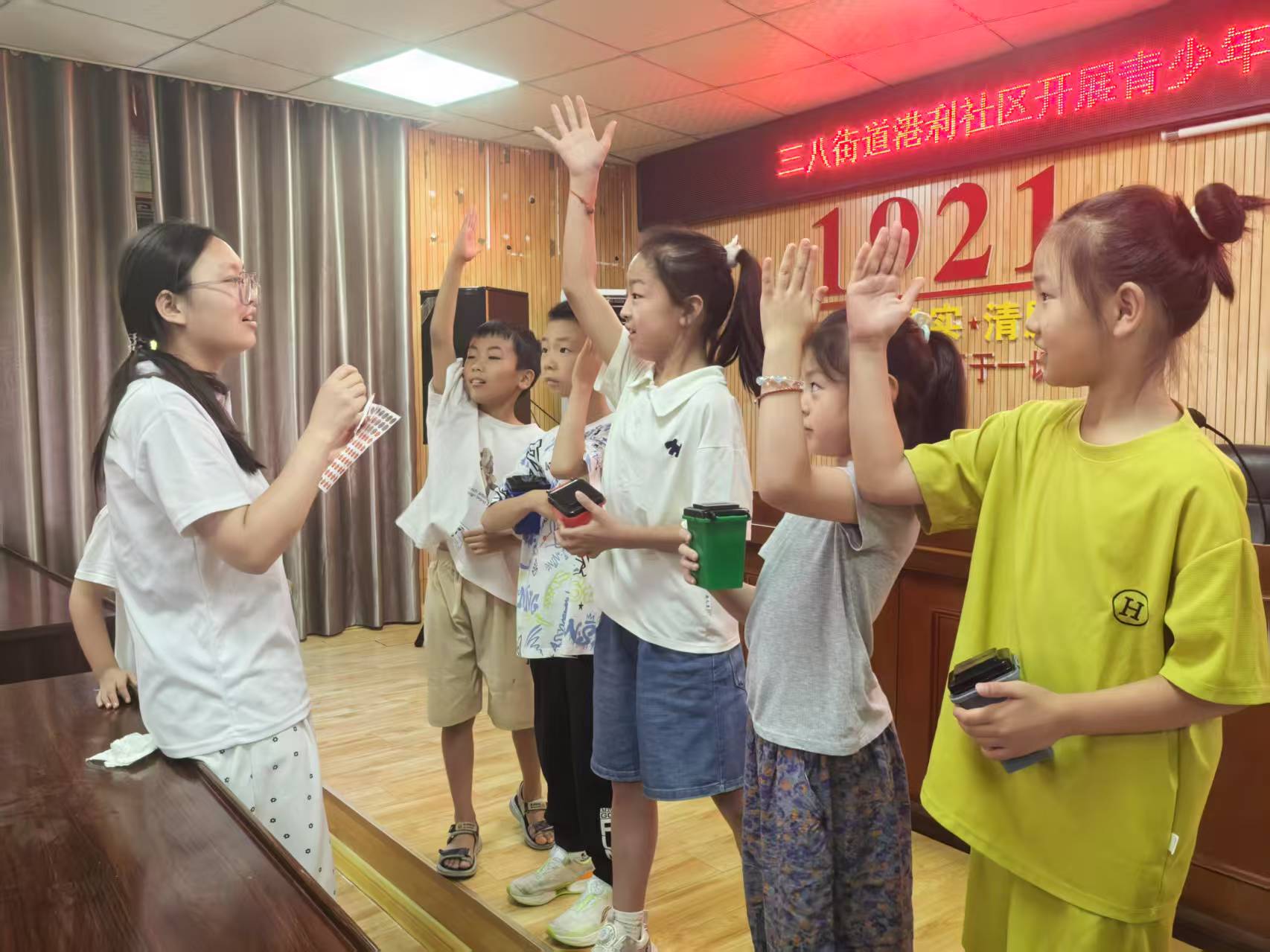 为了让孩子们更好地掌握垃圾分类知识,志愿者们还组织了互动游戏环节。游戏中,孩子们手拿代表不同垃圾的卡片,志愿者们俯身耐心指导,帮助他们判断手中卡片所代表垃圾的类别,孩子们全神贯注,积极参与。