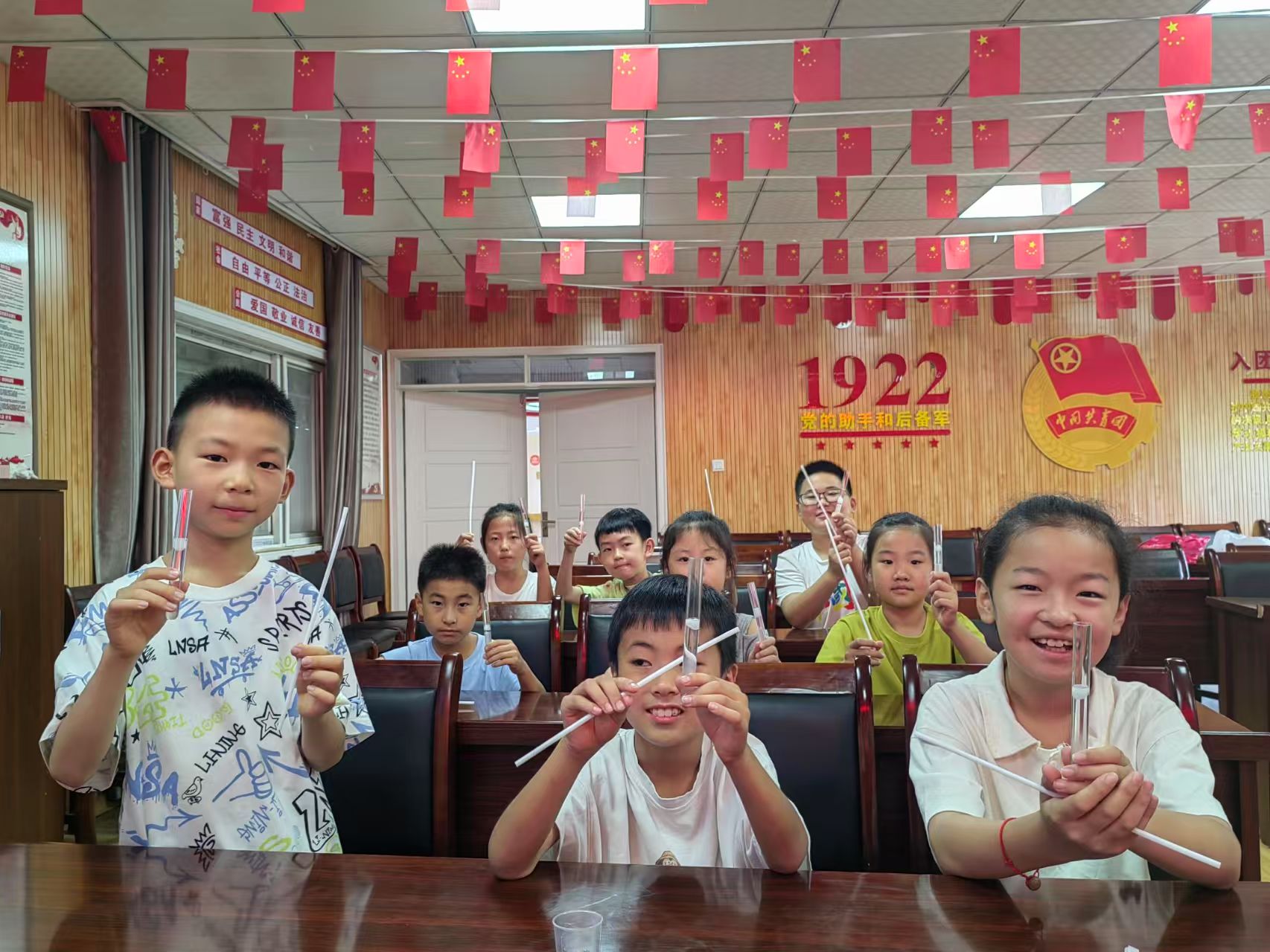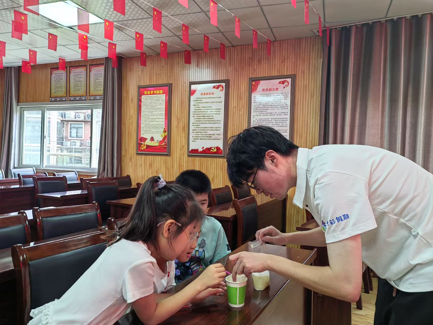 进入实操环节,志愿者们化身“科学导师”指导孩子从准备实验器具到规范操作提取步骤,耐心帮助孩子完成香蕉研磨、加入试剂等流程。孩子们手持试管,眼神专注,在志愿者协助下见证香蕉汁液逐渐析出白色絮状物的DNA物质,兴奋与好奇溢于言表。