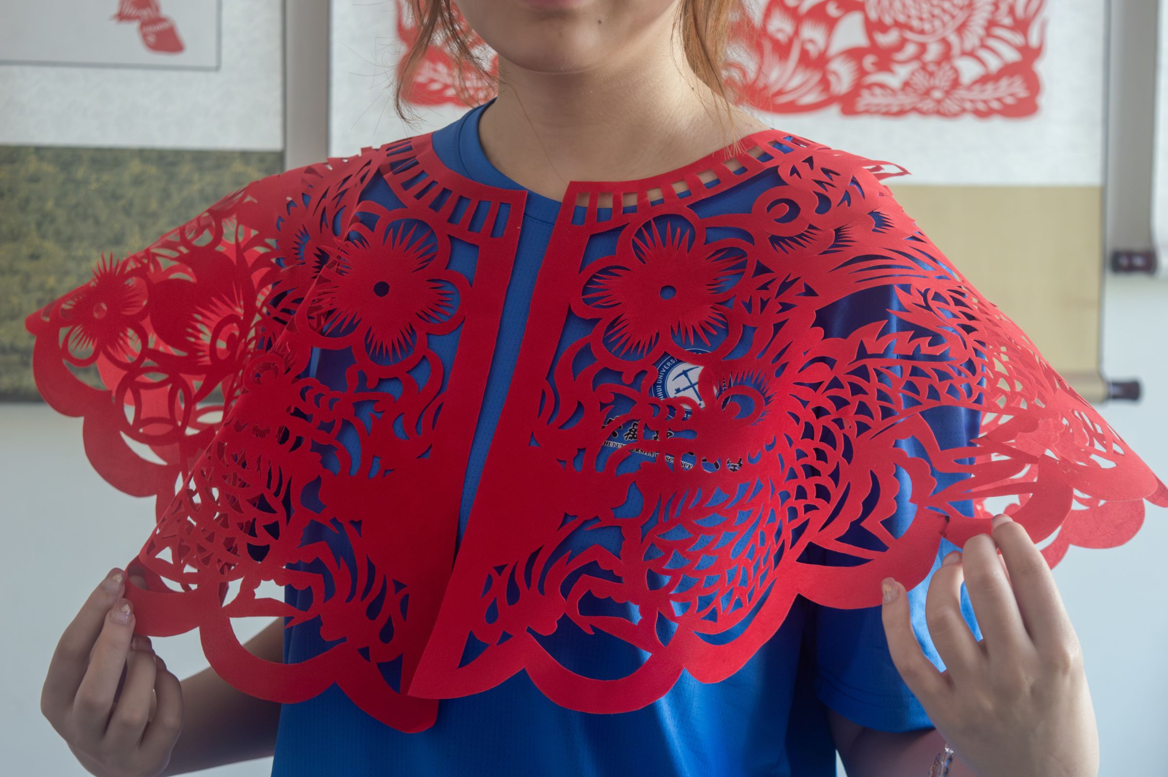 阳光透过树叶的缝隙洒下,形成一片片跳跃的光斑。实践团前往砖集镇刘广军剪纸艺术工作室及砖集中学手工教室,在老师的带领下,团队成员有幸欣赏到了其他老师的艺术作品,如库淑兰老师等。同时实践团系统性的学习了刻画与剪纸艺术的技法差异,特别是通过是实物对比,深刻体会到工业剪纸与手工剪纸在锯齿纹样处理上的不同。随后,团队成员试穿了刘老师精心制作的绒布云肩,传统服饰与非遗剪纸文化相碰撞,让界首剪纸“活”当下。之后参观了手工教室内陈列的学生作品,展厅不大,但每一件展品都经过精心布置,当地政府和部门的积极作为为界首剪纸提供了新活力。