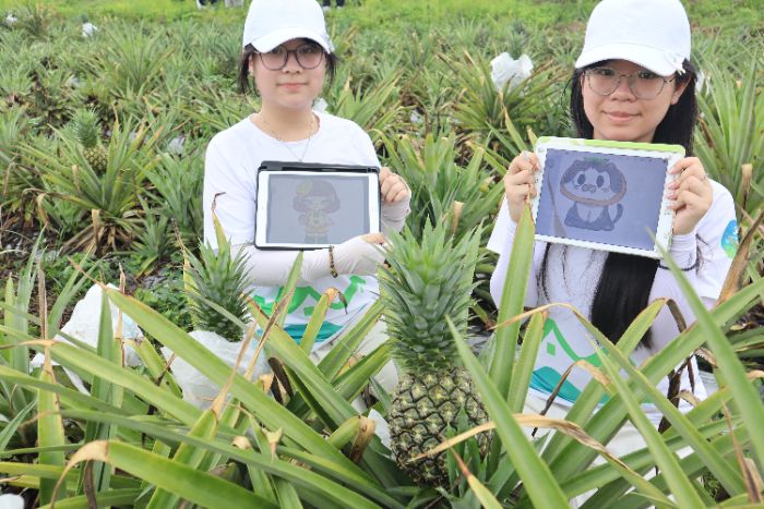 文创组的小伙伴们在凤梨地里仔细观察凤梨形态、生长环境等细节,眼里闪着发现宝藏的亮光,不断获取IP形象的灵感碎片,在平板上勾勒,渐渐拼凑出鲜活模样,还为后续文创设计积累更多素材。
