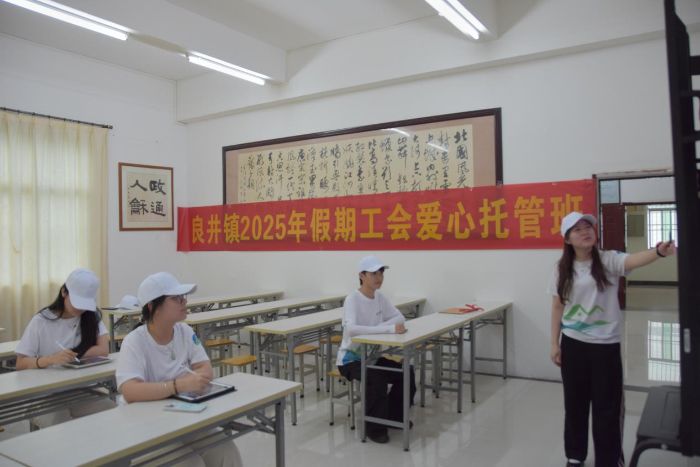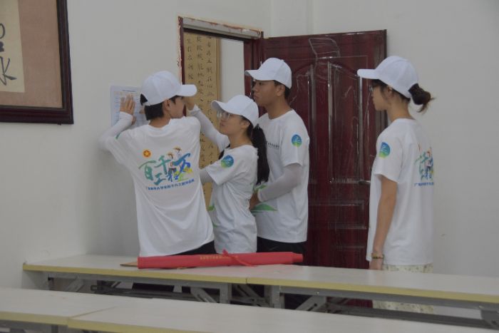 队员们进行课室课程表粘贴、横幅粘贴等工作,大家互相配合,很快就完成课室的布置,为后续暑期课堂课程提供了坚实保障。