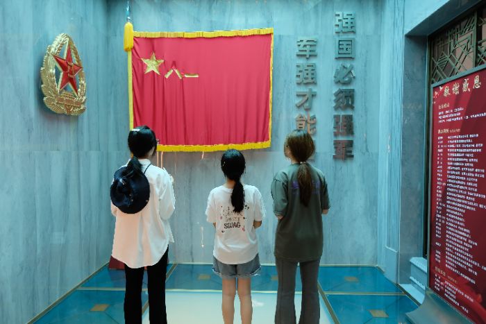 图为志愿者带领孩子们参观八一军旗。许灏然供图
