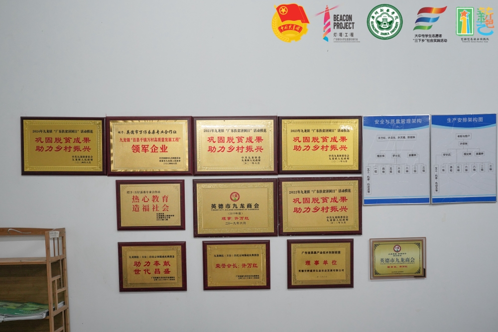 图为英德市万仔蚕桑专业合作社部分荣誉牌匾 李伊楠摄 参观过程中,合作社的有关工作人员详细的给队员们介绍了对桑芽菜加工的主要流程。