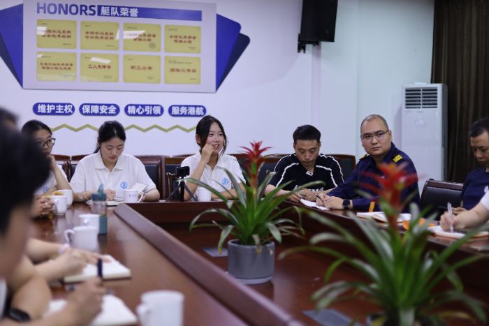 7月1日,实践团前往大港引航站进行参观与访谈。在座谈中,实践团与引航员、资深船长等深入交流,了解行业动态。我校优秀校友、基地艇队队长吴建文等对同学们关切的问题耐心解答,并希望同学们夯实基本功、深耕专业、提高社交能力。实践团还参观了全国首艘铝合金喷泵船“甬港引01号”,近距离观察驾驶台、机舱等船舶重要场所,直观感受船舶行业前沿技术。