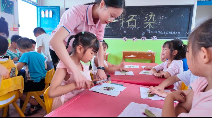 ▲图为团队成员在帮助孩子们拓印染色