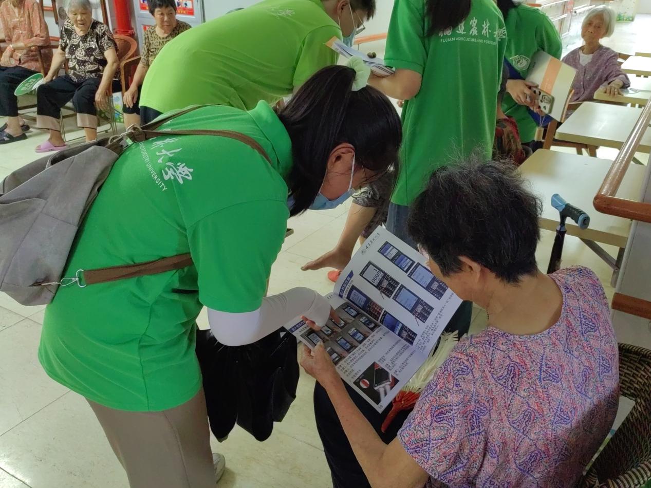 图为实践队员在手把手教老人使用老人机