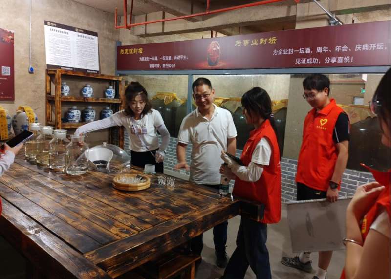 酿造车间里,浓郁酒香扑面而来,唤醒了所有人的感官。实践团成员不仅了解到秦酒“清蒸清烧四次清”的独特工艺,更亲口品尝刚出炉的新酿原浆,清澈酒液入口绵柔,回味间尽是传统技艺的厚重。最令人震撼的是占地8000平方米的地下酒窖,成排陶坛整齐排列,封条上的年份标注着岁月沉淀。品尝4年陈酿时,醇厚口感与浓郁香气让实践团成员深刻体会到“时间酿好酒”的哲学,更读懂匠人们“慢工出细活”的坚守。在文化展示区,多媒体互动与实物展品勾勒出秦酒历史脉络,从商周酒器到现代配方,实践团成员在沉浸式体验中感悟传统产业的“双重价值”——既是带动就业的经济引擎,更是凝聚乡愁的文化纽带。