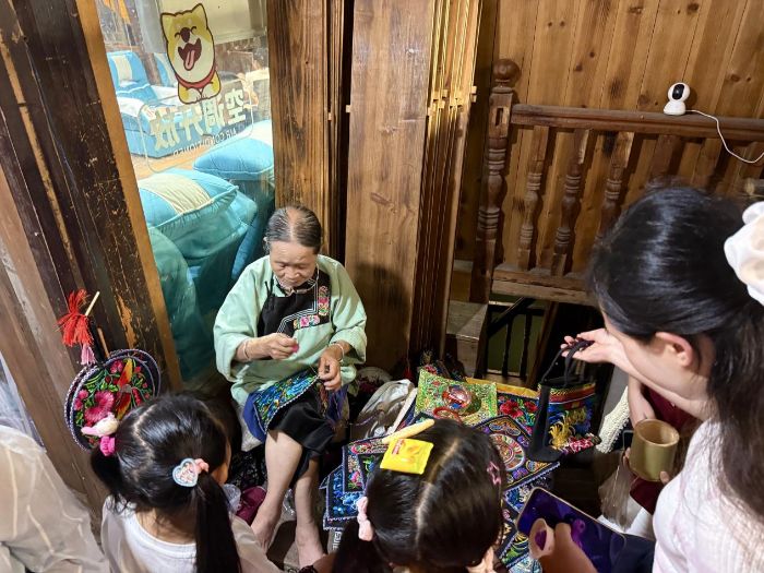作为凤凰古城最核心的IP,"边城"依托沈从文故居构建出"象牙塔"般的世外桃源。穿城而过的沱江、错落有致的街巷与吊脚楼群,共同勾勒出恬淡的湘西画卷。其中,"湘见沱江"主题游船成为现象级爆款项目,通过两岸灯光秀投影湘西百年故事,吸引中外游客纷纷点赞。苗绣摊位前,阿婆展开绣片,指着纹样中的山川湖海意象介绍,“苗族儿女的针脚里,每一针都是故事。”200米外的蜡染传习所内,师傅正指导研学团队体验非遗技艺。"这几年研学体验需求激增,其他地方都没有蜡染的,这是我们的特色。"她笑着说。编彩辫的阿婆一边手里忙活着,一边向调研团解读文化寓意:“苗家女儿出嫁时,兄弟姐妹都要来给姑娘编彩辫,是情谊也是祝福,现在游客体验彩辫,等于把我们的婚俗文化带回家了。”