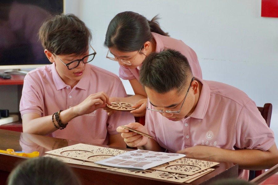 实践队成员崔雪莹的课件里,天坛的藻井如莲花绽放,故宫的斗拱似云霞层叠。“你们看,这些木头与木头的相遇,藏着我们祖先的智慧密码。”当她演示榫卯结构如何不用一根铁钉就能撑起巍峨殿宇时,孩子们的眼睛亮了起来,仿佛看见三百年前的工匠正对着木料精雕细琢。有孩子伸手触摸屏幕上的雕花雀替,指尖划过数字化复原的纹样,历史与现实在此刻完成了一场静默的对话。