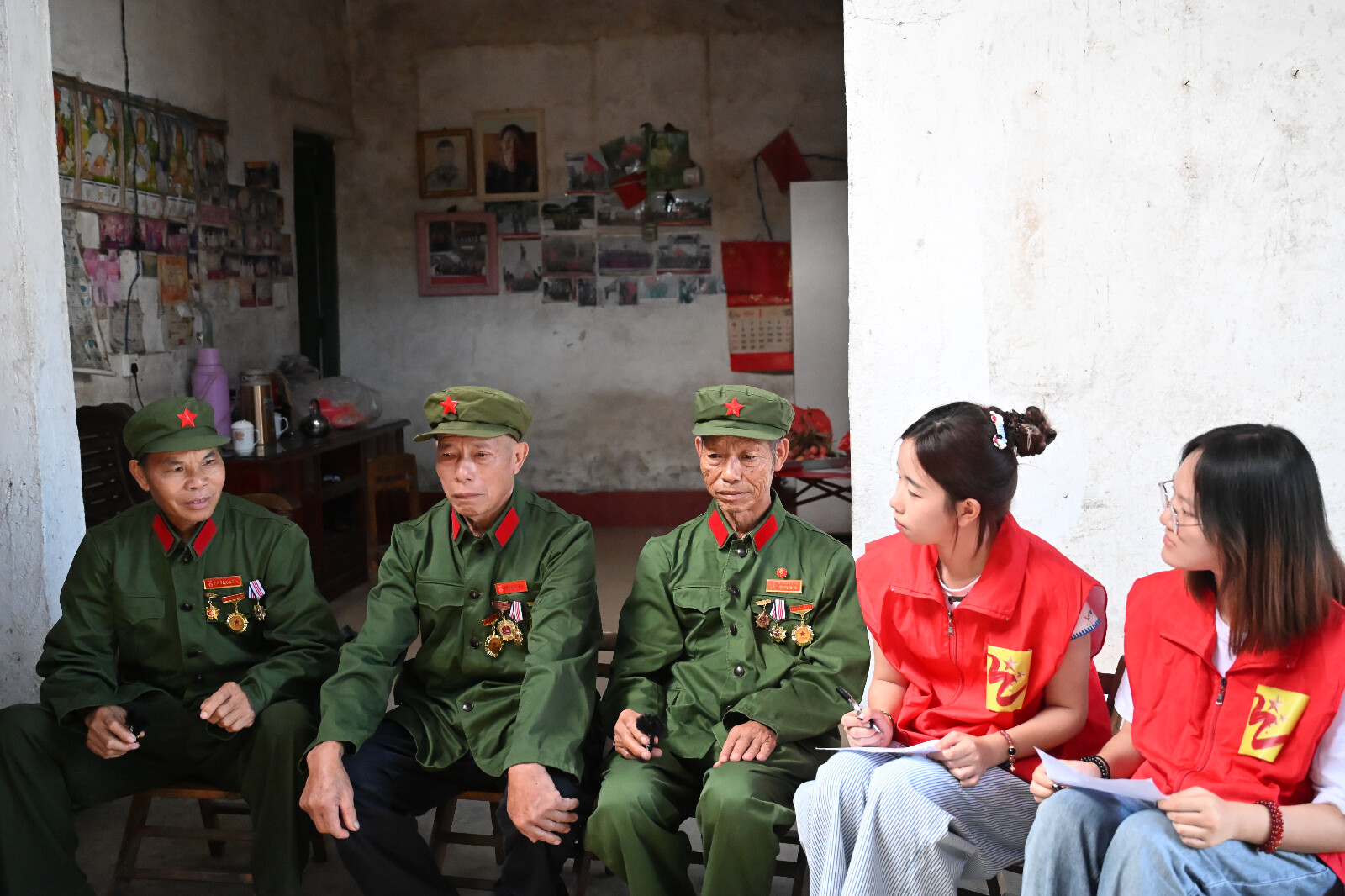 图为图为团队成员采访自卫反击战老兵韦志东(右二)、韦旱连(右三)、石大连(右一)。秦含溪 摄