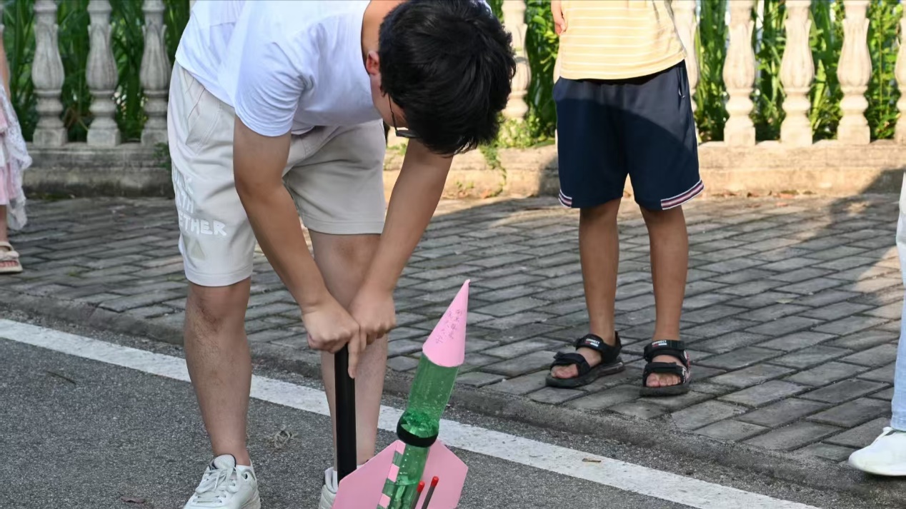 妙手拼装,腾空逐梦 三航课程不仅有科普知识,也给孩子们提供了亲身体验的机会,孩子们对吴通老师的水火箭课程期待已久。老师先通过一个短片,为孩子们展示了我国航天事业的发展,再化繁为简,向孩子们说明了本次水火箭的基本原理。在制作过程中,孩子们也遇到了不少挑战,有的结构组装不合理,有的细节处理不到位。老师认真指导,指出问题所在,对于低年级的小朋友,老师耐心地给予帮助。随着水火箭陆陆续续升空,孩子们朴素的航天梦也跟随火箭飞翔起来,这一刻,支教团成员对孩子们的三航启蒙得到了升华。