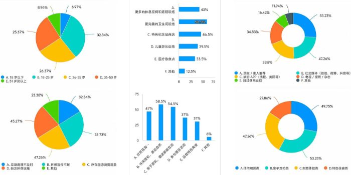 统计分析显示:从需求来看,58.5%的游客期待“更完善的卫生间设施”,43%希望增设“休息座椅和遮阳设施”,反映出景区基础服务仍有优化空间;从环保问题而言,“垃圾清理不及时”“环保宣传不足”占比居前,提示需加强生态管理;从信息来源看,53%的游客通过“社交媒体”了解景区,印证了“网红打卡点优化”的必要性。