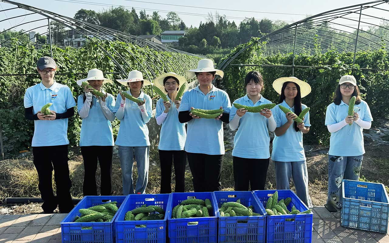 “重庆市售的红苕尖,每三捆就有两捆来自国梁大有田园。”随行的工作人员话语里满是骄傲。我们跟随农户进入大棚,开始协助采摘苦瓜。日上杆头,大棚被高温迅速笼罩,湿粘的汗水沿着脖颈流淌,衣服湿了一片又一片。可当一筐筐高品质苦瓜被填满时,心里的成就感冲淡了盛夏的炎热。