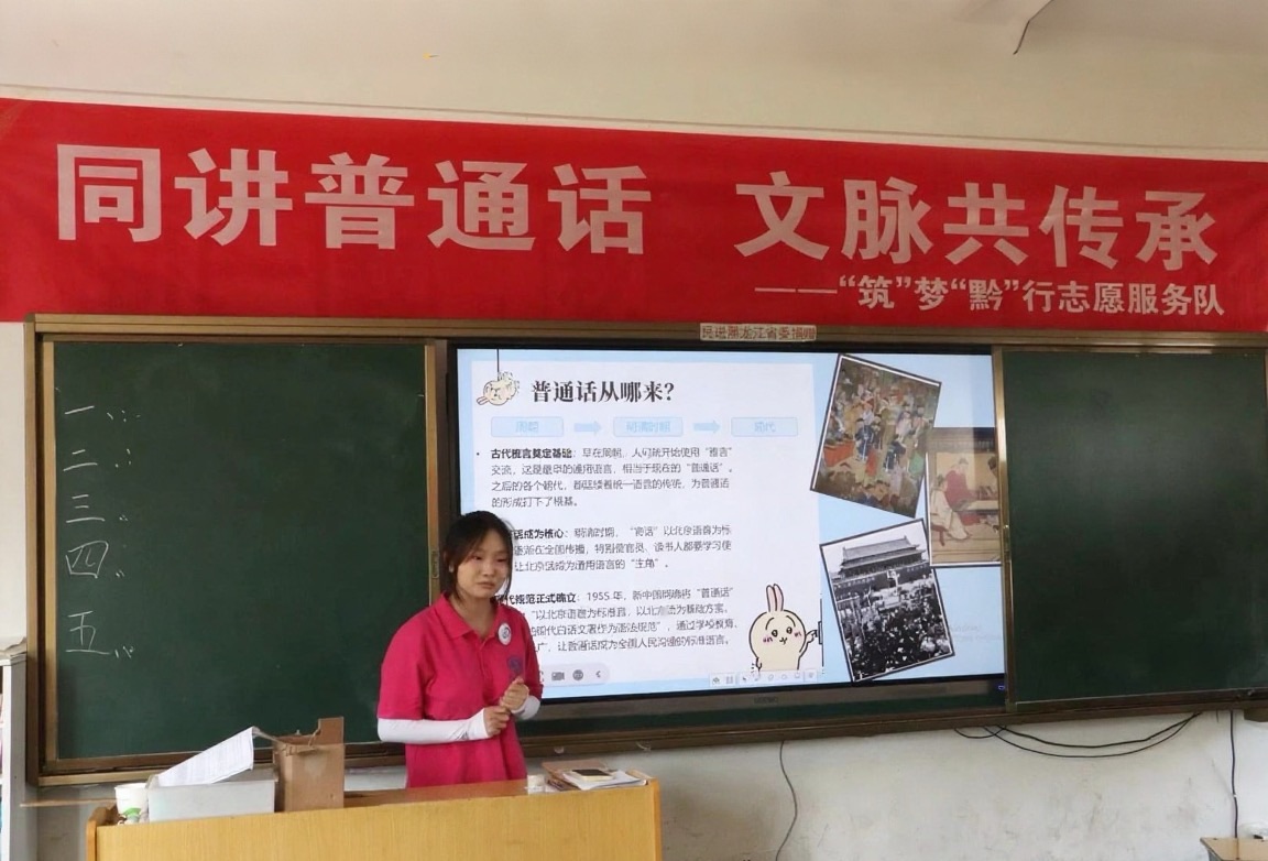 7月15日,毕节市金沙县柳塘镇中心学校的操场上,回荡着孩子们清脆的笑声与志愿者温和的引导声。贵州师范学院外国语学院的“三下乡”实践活动已在此深耕数日,一场场浸润心灵的课堂、一次次扎根乡土的调研,正将城乡共育的画卷在黔北大地徐徐铺展。 语言课堂里的文化交响 普通话宣讲课上,外院志愿者们以语言为桥,架起了趣味与深意的纽带。当萌趣方言遇上标准普通话,“吃饭”的软糯乡音与清晰发音碰撞出阵阵欢笑,孩子们在对比中捕捉词汇发音的微妙差异,更在志愿者的解读里触摸到方言背后流淌的地域文化基因。“原来‘月亮’在咱们这儿叫‘亮晃晃’,普通话里还有这么多门道!”二年级学生道出了孩子们对语言魅力的全新认知,也让推广普通话的意义在轻松互动中悄然扎根。
