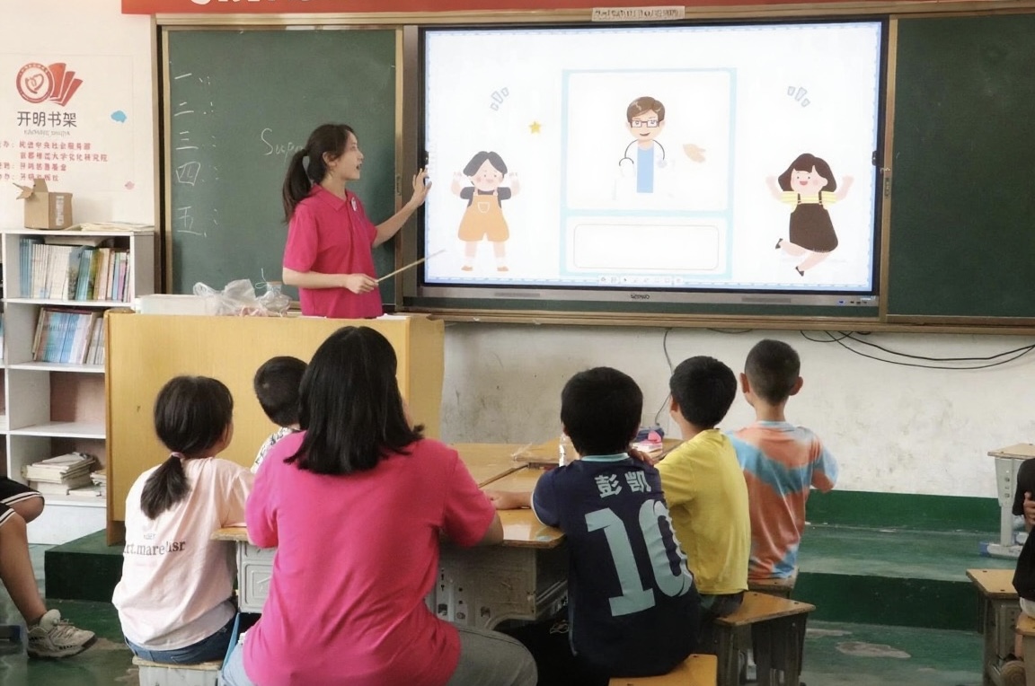 梦想画布上的纯真底色 “梦想的职业”英语课堂中,志愿者们用双语引导打开了孩子们的想象空间。“I want to be a teacher,like you!”(我想成为像你们一样的老师)三年级学生用略显生涩的英语表达心愿时,眼中闪烁着对知识传承的向往;“To be a doctor,help grandparents”(想当医生,帮爷爷奶奶看病)的童声里,则藏着对乡土最质朴的眷恋。志愿者们细心记录下这些纯真愿景,让每一份对未来的憧憬都得到温柔呵护,也让奋斗的种子在双语交融的语境中悄然萌芽。