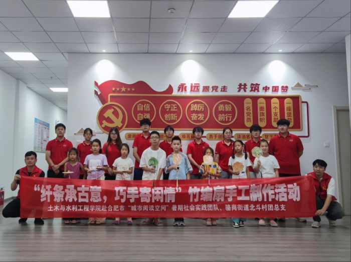 为深入学习贯彻习近平总书记关于非物质文化遗产保护和乡村振兴的重要讲话精神,增强青少年对中华优秀传统文化的认同感与传承意识,丰富农村儿童暑期生活,2025年7月14日,合肥工业大学土木与水利工程学院“城市阅读空间”暑期社会实践团队走进合肥市包河区北斗村,开展“传承非遗童心筑梦”主题实践活动。此次活动以竹编扇手工体验和趣味积木塔游戏为载体,在孩子们的欢笑声中,将传统技艺的温度与青春支教的责任一同送入乡村儿童的心中。