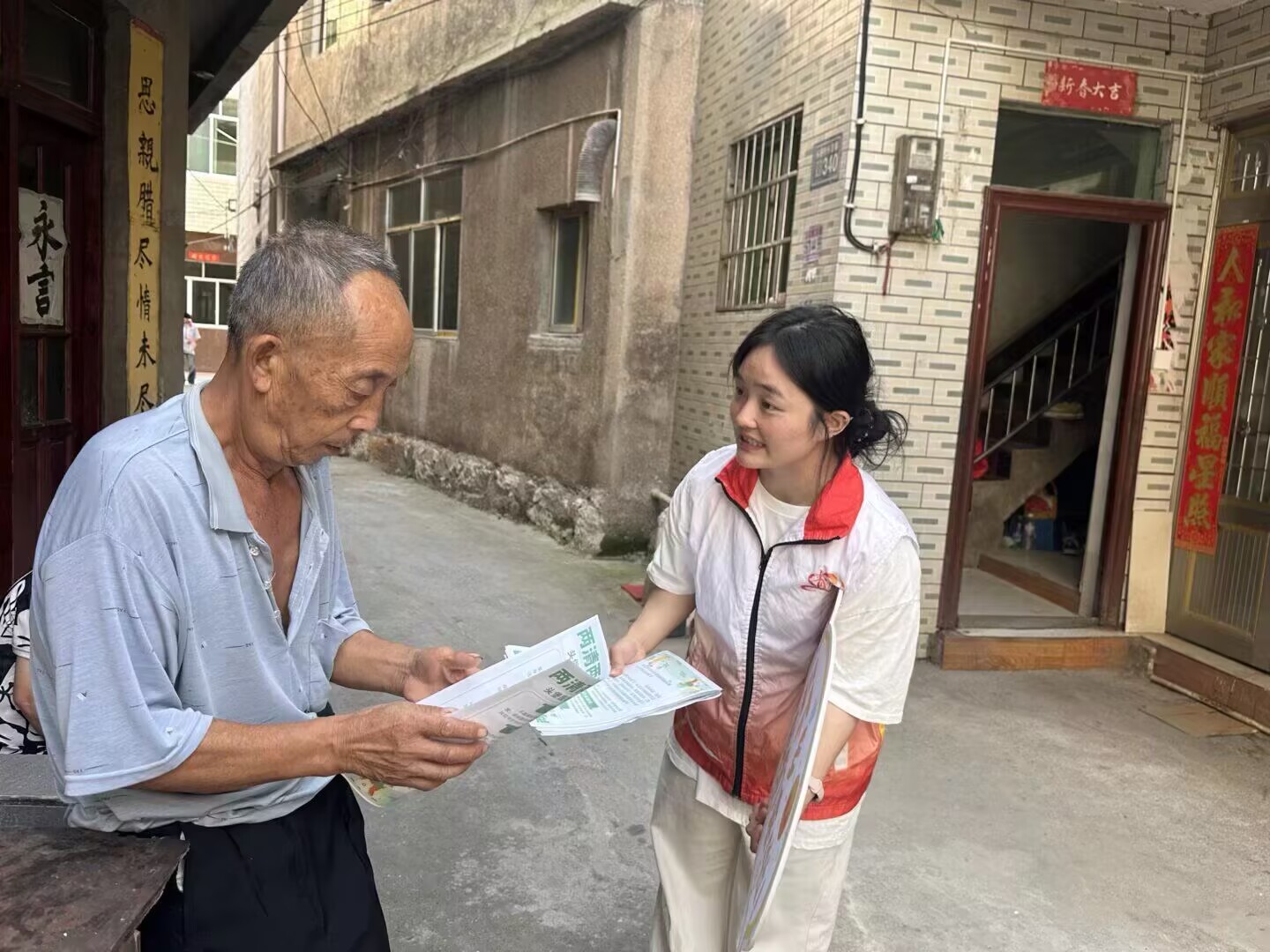 临近午饭时,村庄逐渐热闹起来,实践团成员们转向村民活动较为集中的区域。在村小卖部周边,成员们将 KT 板放在树荫下,向过往村民分发宣传单。有村民接过单子后随手翻看;遇到正准备回家烹饪晚餐的村民,成员们会先帮忙搭把手,为村民提起沉重的菜筐,再顺势递上宣传资料。整个宣传过程井然有序,没有刻意的喧哗,却让 “两清两改两治理” 的政策要点随着一张张宣传单、一块块 KT 板,慢慢融入村庄的日常场景。