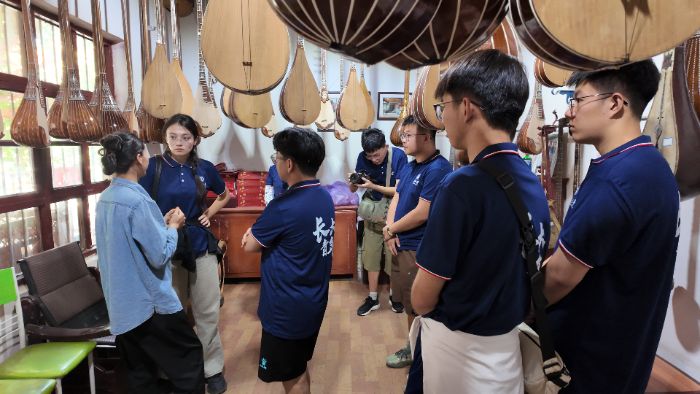 图为艾依提之女热汗古丽为团队成员讲解传统民族乐器“都塔尔”及“弹拨尔”的制作工艺。汤皓添摄