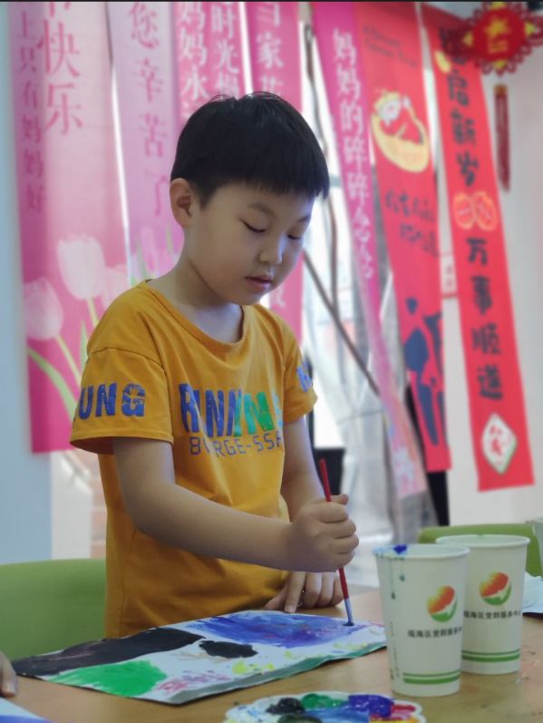 在孩子们丰富的想象力下,活动现场瞬间化作创意的海洋。有的作品用深蓝色水彩涂满画面下半部分,象征汹涌的洪水,上方则画着一家人手牵手向楼顶转移,楼顶飘扬着一面小红旗,旁边用歪扭的字迹写着“洪水来了,往高处跑!”;有的小朋友专注地在画纸左侧画了一排“防汛物资储备箱”,里面排列着手电筒、矿泉水、创可贴等救灾物资,右侧则是穿着雨衣的志愿者搀扶老人的场景,色彩明亮而温暖;还有的孩子别出心裁,用黑色和黄色的颜料在洪水边缘画了几道闪电,旁边配文“暴雨天,别出门”,用夸张的笔触强调避险的重要性。