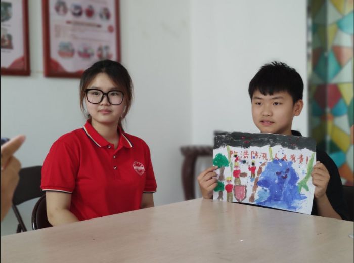 创作过程中,实践队员们在各组间穿梭,时而俯身倾听孩子的创意,时而轻声提示。创作过程中,孩子们的思维不断碰撞:“我要画一艘冲锋舟!”“还要画无人机送物资!”一个个充满童真却又切中要点的想法,让防汛知识在画笔流转中自然内化。