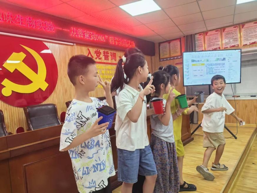 在志愿者分组指导下,实验正式推进。孩子们先把香蕉切成小块、捣成泥,看着香蕉“变形”,兴奋得拍手叫好。接着加入含洗洁精和食盐的溶液,志愿者解释:洗洁精能“打开细胞大门”,食盐可助力DNA聚集 。孩子们小心翼翼用玻璃棒搅拌,眼神专注又认真,那股子对知识的执着劲儿,仿佛在搅拌中能搅出生命的奥秘。