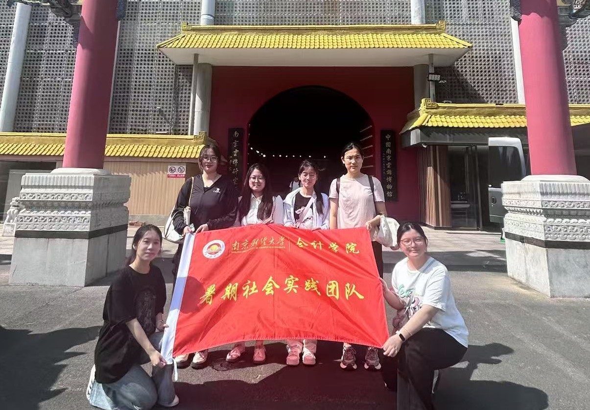 7月13日,南京财经大学“云锦流光映青春,文化薪火耀乡途”三下乡团队踏入南京云锦博物馆,由此开启了一场沉浸式的非遗文化探寻之旅。团队以“挖掘文化底蕴、赋能传统传承”为目标,通过实地调研、人物专访、体验实践等多元形式,解码云锦千年技艺密码,为非遗在当代的创新性发展注入青春动能。 踏入博物馆,精美的云锦展品令人目不暇接,团队成员立刻被这一传统工艺的独特魅力所吸引。绚丽的色彩、复杂的织造工艺,每一处细节都彰显着云锦的珍贵与独特。在参观的过程中,博物馆的工作人员向团队介绍并展示了云锦文化的来源、发展、价值和云锦的制作方法。此次参观,团队有幸观看云锦织造技艺的现场演示,织工们的现场操作,使团队成员直观地感受到了云锦织造的精妙。这台高4米、由1924个构件组成的“纺织活化石”,需要两名工匠默契配合——楼上拽花工按纹样提综开口,楼下织手穿梭引线,其繁复工艺令在场众人惊叹不已。当谈到云锦入选世界非物质文化遗产的核心价值,工作人员强调,云锦不仅是精美的丝织品,更是中华传统文化的载体。其独特的妆花技艺,能在同一织物上织出多种色彩和图案,能够称得上是纺织工艺的奇迹。同时,云锦还承载着丰富的历史、文化和艺术信息,具有极高的历史与艺术价值。