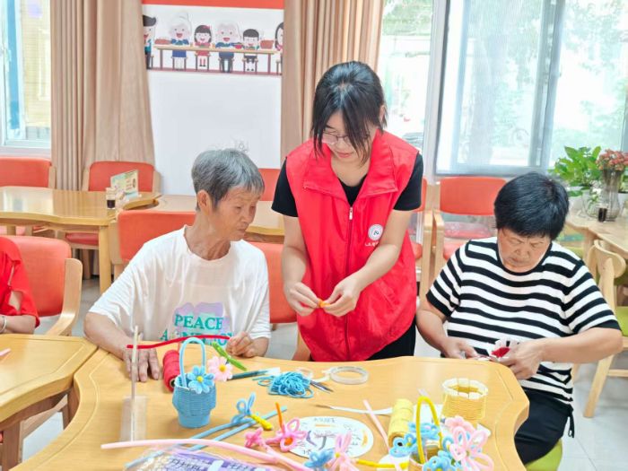 手工传情,点亮心芒 手工活动区,志愿者备彩色扭扭棒,教老人做花朵、花篮。从弯折到组合,耐心示范,帮动手不便老人完成作品。老人专注创作、互展成果,扭扭棒化作可爱物件,锻炼手部灵活,更赋予成就感与快乐 。