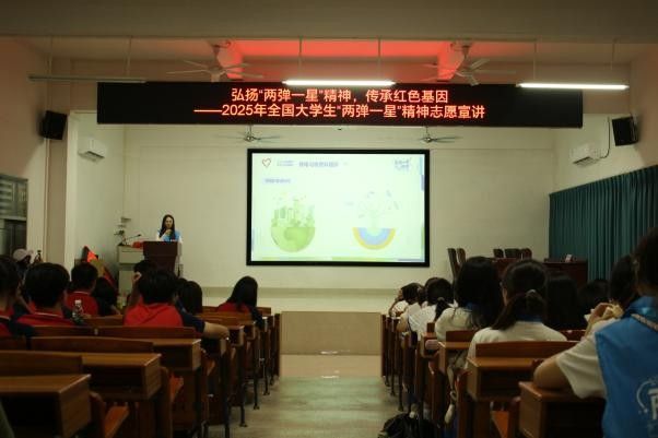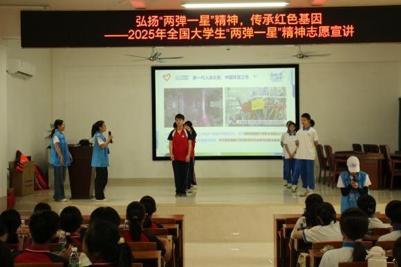 为全面贯彻落实党的二十大精神,引导新时代青年坚定爱国报国信念,大力弘扬与传承“两弹一星”精神,激发青年学子对科技创新的热情和民族自豪感。7月9日,仲恺农业工程学院经贸学院青耘逐梦青年突击队前往佛冈县高岗中学开展2025年全国大学生“两弹一星”精神志愿宣讲活动。