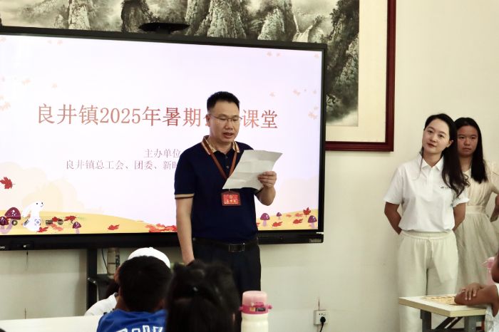 良井镇2025年暑期公益课堂在良井镇新时代文明实践所正式启动。良井镇总工会副主席杨达安出席开班仪式,并致辞:“感谢广东科技学院惠艺启楼突击队为乡镇孩子带来丰富多彩的课程”,杨主席表示,“希望孩子们珍惜学习机会,让这个暑假收获知识更收获成长”。