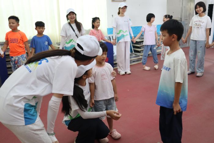 图为广东科技学院惠艺启楼突击队队员们和小朋友们参加破冰活动(王婧颐摄)