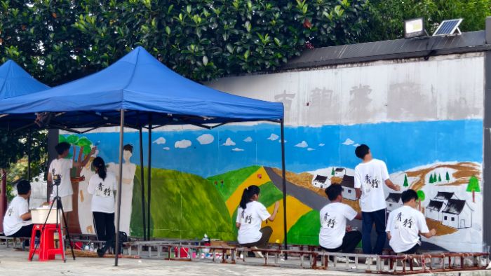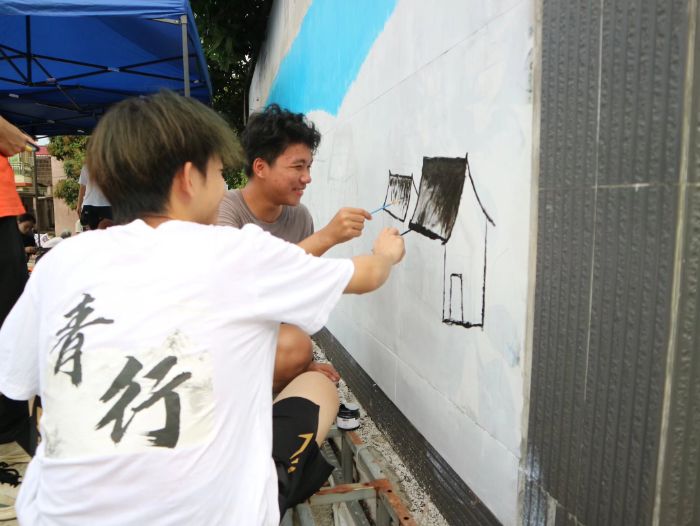 图为“青行”实践团成员按分工完成墙绘。郑铠泓供图